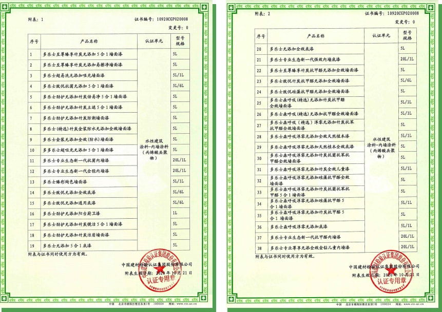 2020年10月,多乐士系列内墙漆荣获国家级殊荣——首批建筑涂料“绿色”产品认证,这也是目前对于涂料产品环保性能要求最高的国家级认证