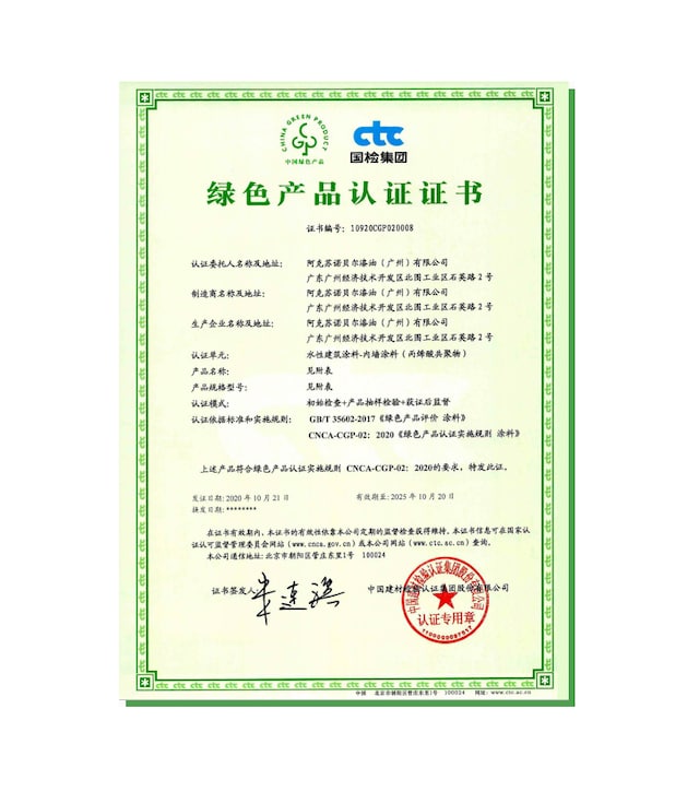 依据GB/T 35602-2017《绿色产品评价 涂料》以及CNCA-CGP-02:2020《绿色产品认证实施规则 涂料》,多乐士森呼吸、劲护、金装、至尊、致悦等产品线获得国检集团“中国绿色产品”认证。