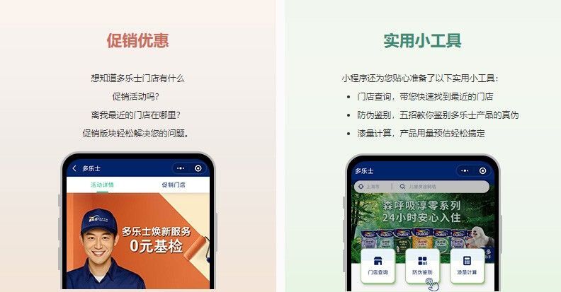详尽的产品介绍,丰富的优惠信息,1对1色彩设计服务,更有便捷的门店查询、