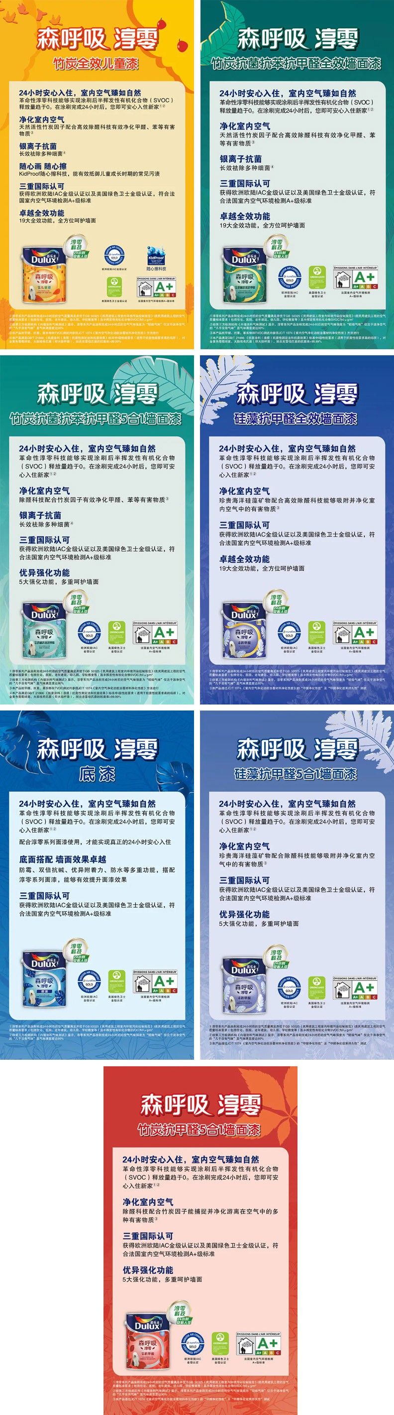 多乐士上市森呼吸淳零系列,共有6款面漆及1款底漆,不仅是凝结了多乐士十余年环保科技的诚意之作,更是引领环保墙面漆领域发展的里程碑产品。多乐士森呼吸淳零系列采用革命性淳零科技,主打“24小时安心入住,室内空气臻如自然”的口号,是新一代的环保产品。