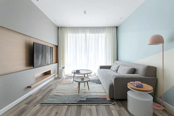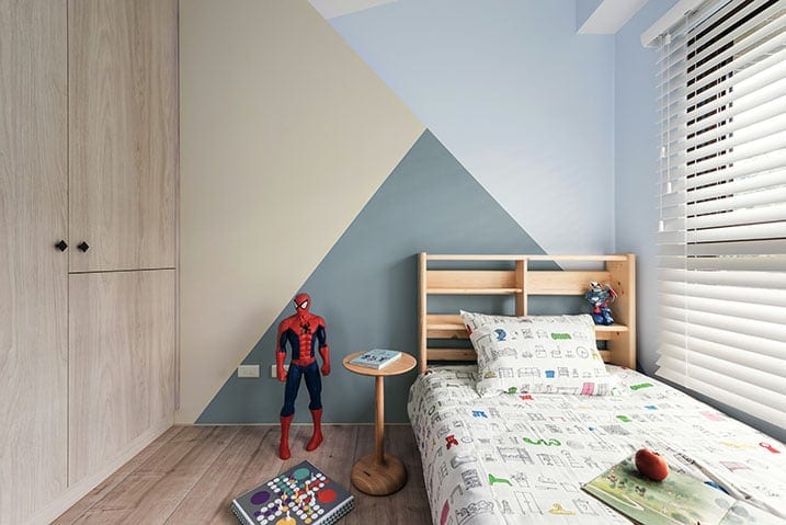 带着年代感的木地板与布艺沙发也也可以随着空间的色彩流动迸发出新的活力。青灰蓝、月光蓝与霜雪白的浅色组合,在墙面以几何形塑造出创意十足的图案,显得年轻而富有朝气。