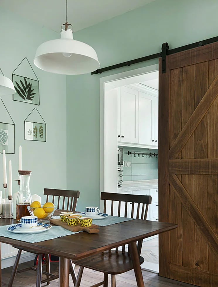 带着古典气质的青瓷绿给空间蒙上一层诗意,而与之相契合的家居风格,以简洁的古典风格为宜,在胡桃木的映衬下,整个空间显得优雅而淡然。