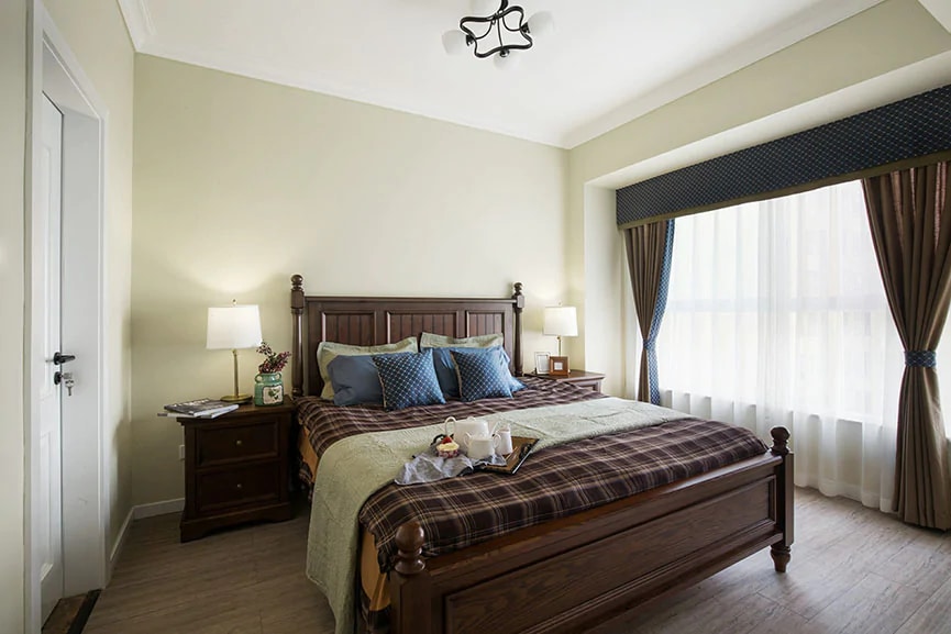 柔和的米白色属于白色系,却在纯然中增添了一丝温暖,仿佛阳光洒满了房间一般带着香味。搭配美式的木质家具,展现出主人的格调与生活的质感。