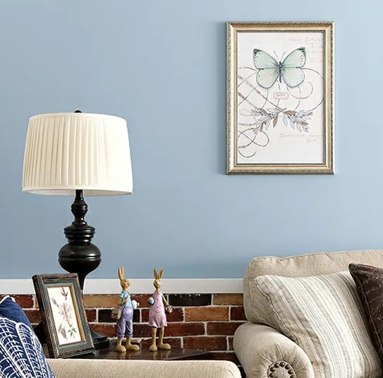 青灰蓝的清澈仿佛夏日里的一股亲故清泉,而搭配布艺家具则让这抹清爽多了一份温润,加上红砖文化墙,增添室内的层次感与细节,更增添一份老宅的韵味。