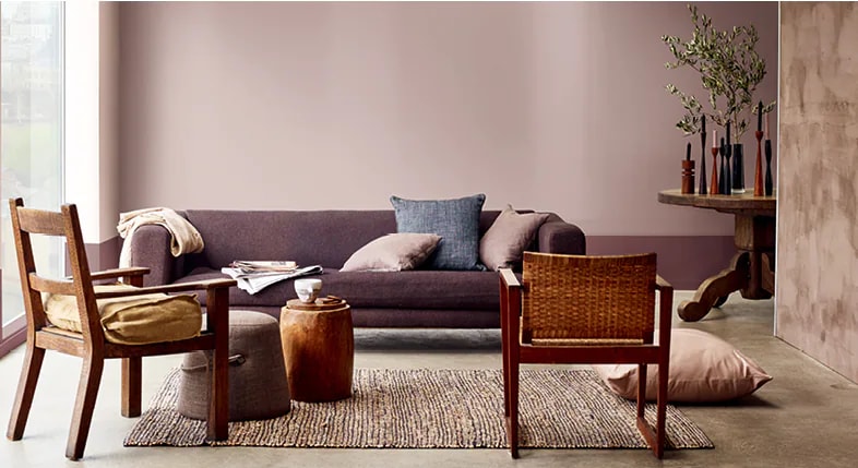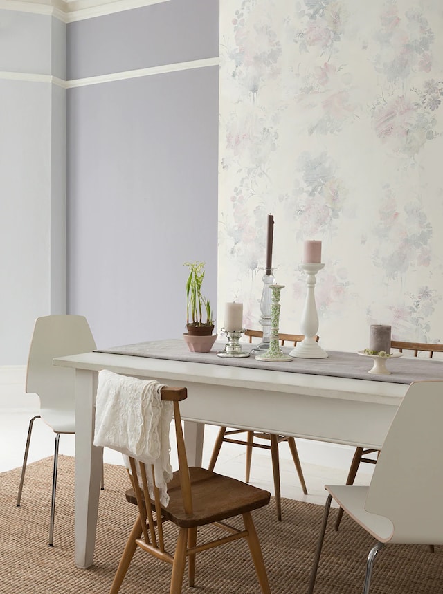 烟紫色的优雅运用于墙面上,将恬静延续到空间的每一个角落,搭配白色的家具与配饰,更增法式气息。